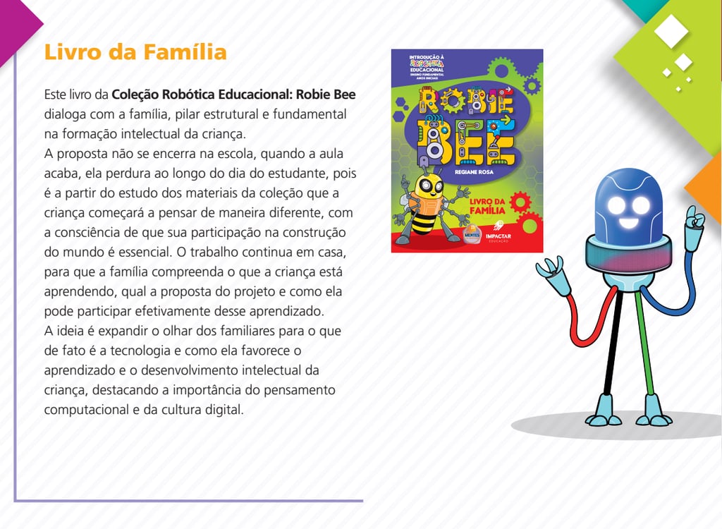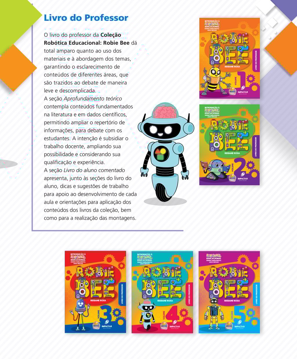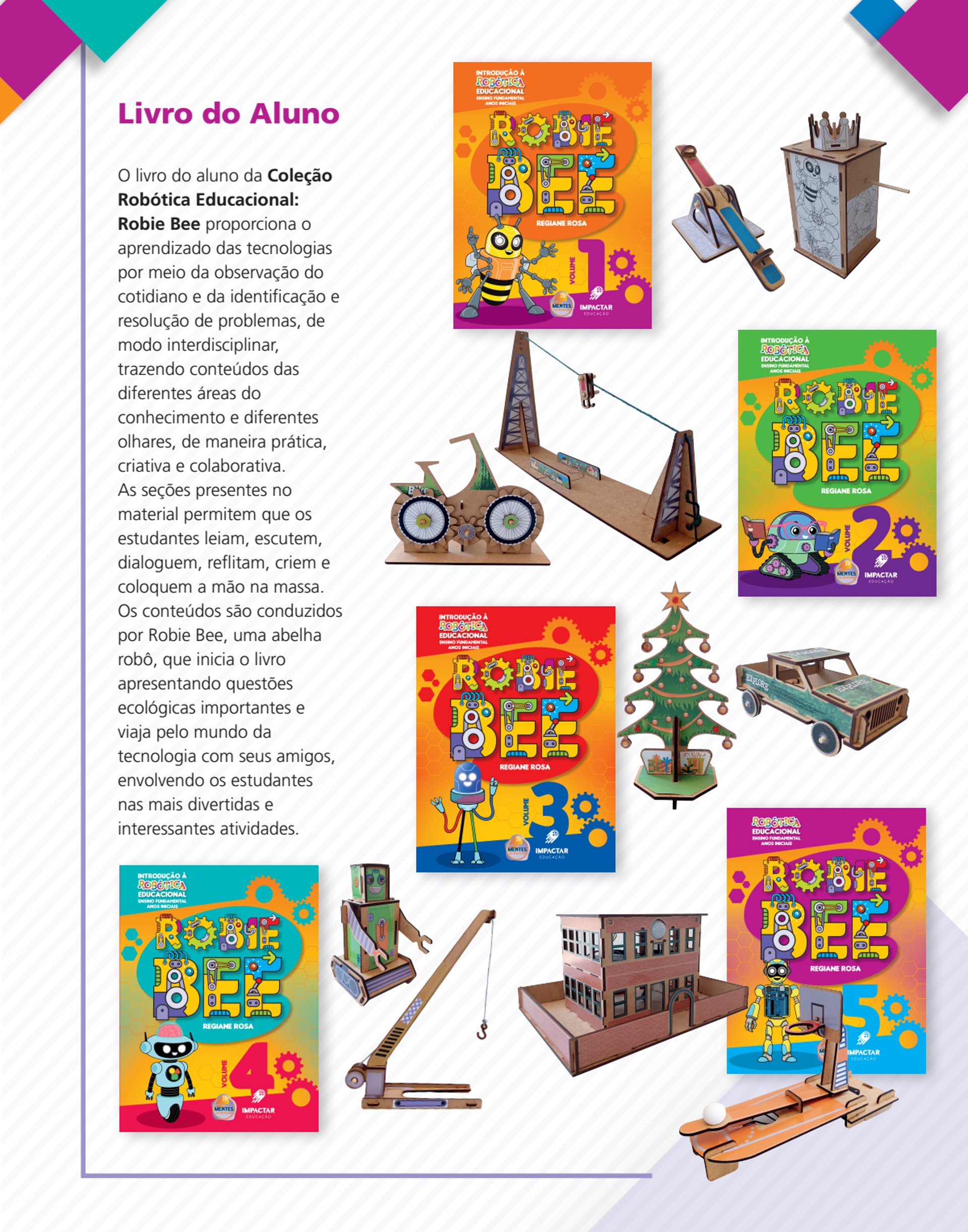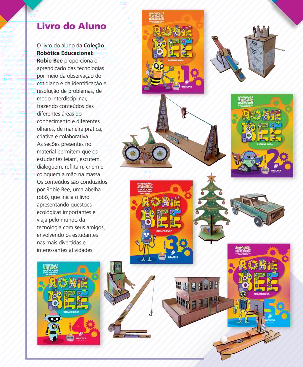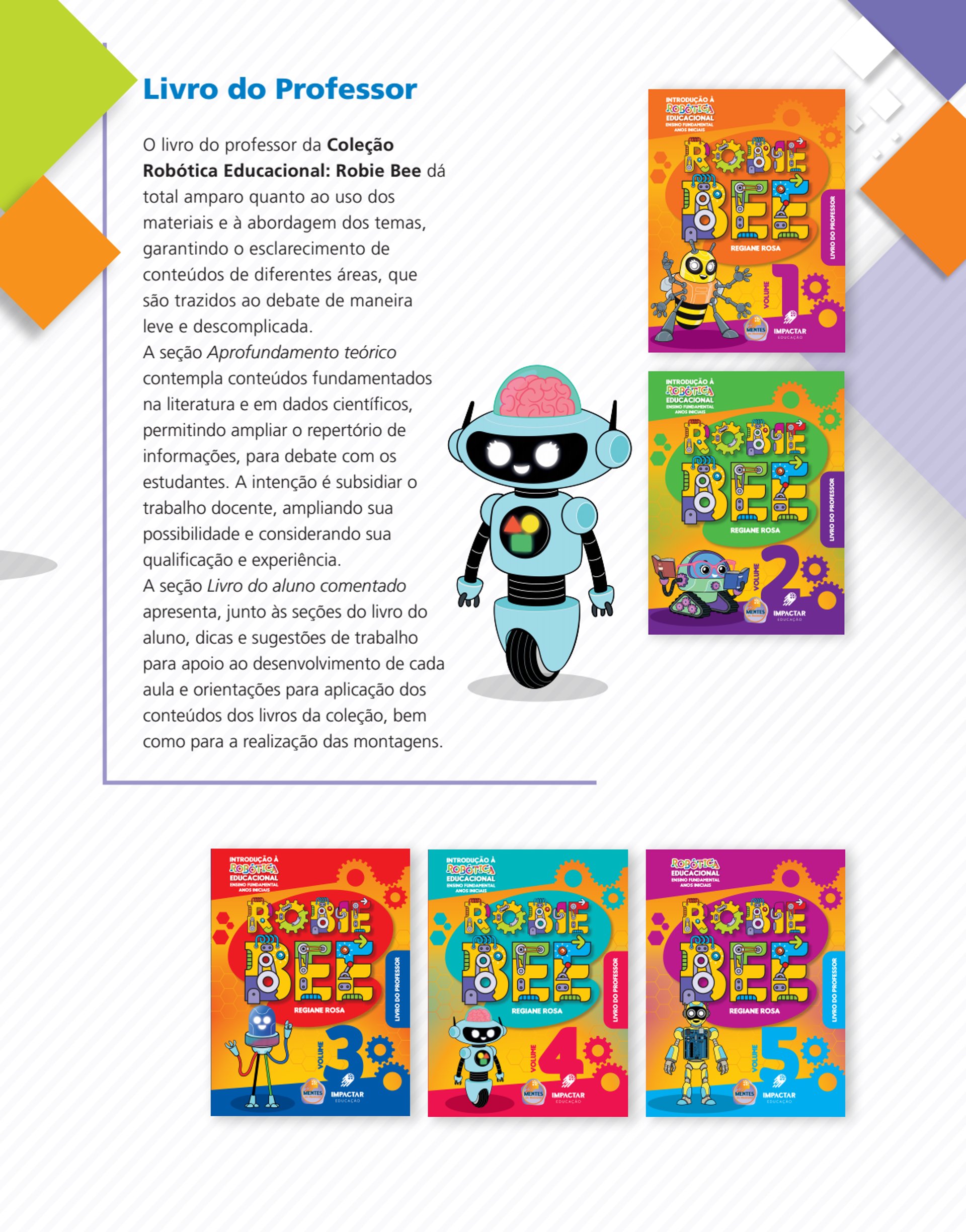 O NOME ROBIE BEE FOI INSPIRADO NA JUNÇÃO DAS PALAVRAS ROBÓTICA E ABELHA – BEE É ABELHA, EM INGLÊS. AGORA, VOCÊ DEVE ESTAR SE PERGUNTANDO: QUAL A RELAÇÃO DA ROBÓTICA COM A ABELHA? A ROBÓTICA É UMA CIÊNCIA QUE ESTUDA A CRIAÇÃO E A APLICAÇÃO DOS ROBÔS, OS QUAIS NEM SEMPRE SÃO MODELOS HUMANOIDES QUE REALIZAM ATIVIDADES PARECIDAS COM AS NOSSAS. GERALMENTE SÃO MÁQUINAS E PODEMOS VÊ-LOS EM MUITOS LUGARES: EM PORTAS AUTOMÁTICAS, CALCULADORAS, COMPUTADORES, MÁQUINAS DE LAVAR, CONTROLES REMOTOS E, PRINCIPALMENTE, NA INDÚSTRIA. EXEMPLAR PARA AVALIAÇÃO OS ROBÔS FUNCIONAM DE MODO AUTOMÁTICO, CONTROLADO OU PROGRAMADO PELOS HUMANOS, PODENDO APRESENTAR MOVIMENTO. ELES PODEM SER DESENVOLVIDOS PARA SOLUCIONAR UM PROBLEMA OU FACILITAR A VIDA HUMANA. E AS ABELHAS? SÃO INSETOS MUITO IMPORTANTES PARA O MEIO AMBIENTE, POIS SÃO POLINIZADORAS, FUNDAMENTAIS PARA A MANUTENÇÃO DA MAIORIA DOS VEGETAIS. ELAS TÊM UMA CAPACIDADE INCRÍVEL DE RESOLVER PROBLEMAS E VIVEM EM SOCIEDADE DE MANEIRA MUITO ORGANIZADA. CADA CASTA DE ABELHAS TEM UM PAPEL DIFERENTE NA COLMEIA E, JUNTAS, ELAS CONSTROEM OS FAVOS, PRODUZEM O MEL E MANTÊM TUDO FUNCIONANDO PERFEITAMENTE. SE PENSARMOS NA INTELIGÊNCIA DAS ABELHAS E NA SUA INCRÍVEL CAPACIDADE DE RESOLVER PROBLEMAS EM EQUIPE, ASSIM COMO NO PAPEL DA ROBÓTICA EM NOSSO COTIDIANO, FACILITANDO E MELHORANDO A NOSSA VIDA, ENTENDEREMOS QUE A ROBIE BEE É UMA EXCELENTE REPRESENTANTE DA ROBÓTICA EDUCACIONAL. VAMOS, JUNTOS, DESCOBRIR COISAS NOVAS, RESOLVER PROBLEMAS E CRIAR SOLUÇÕES CRIATIVAS?